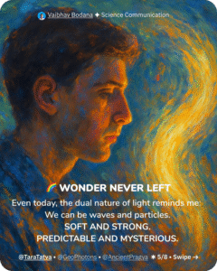The dual nature of light—sometimes a wave, sometimes a particle—blew my mind. It wasn’t just about photons; it was about people. We all carry dualities. I can be deeply emotional and fiercely logical. Physics didn’t try to simplify that—it celebrated it. NASA explains this wave-particle duality as a central mystery of quantum physics. It reminded me: I can be flexible like a wave when life flows, and solid like a particle when I need to stand my ground. Around 65% of students I’ve taught say they’re pressured to “choose” between being artistic or analytical. But light doesn’t choose. Why should we? In class, I show students how a laser beam is both precise and poetic. That’s what I want for them too—to see science not as rigid, but as room to explore all sides of who they are. Duality isn’t weakness. It’s wonder.