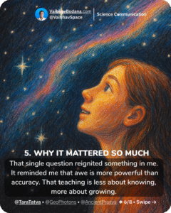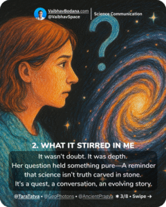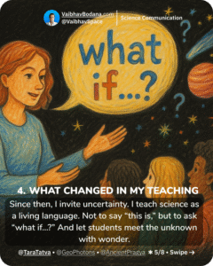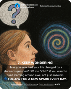 Now, I start every class with this line: “Ask the question that makes us pause.” It tells students that confusion isn’t a failure—it’s fuel. Across India, educators are embracing inquiry-based learning, with 20% of CBSE schools now adopting integrated STEM methods. I share how myth, math, and meaning can all meet in a single question. One day it’s gravity, another day it’s gods and galaxies. Because learning, like life, isn’t linear—it spirals outward. That girl didn’t just ask a question. She asked me to become a better teacher.