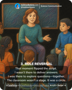 Before that class, I saw my role as a science “explainer.” I had notes, models, even Manim animations. But now? I treat every class like a conversation. In a 2022 survey, over 60% of Indian educators said they felt pressured to “cover the syllabus” instead of exploring deeper thinking. But when we stop aiming for “right answers” and start listening, classrooms change. I’ve shifted from giving talks to guiding journeys. A circle of curiosity has replaced the front-facing format. We co-create meaning. Every question is a chance to pause, reflect, and rewire. And the kids? They’ve stopped fearing being “wrong.” They’ve started owning the wonder.