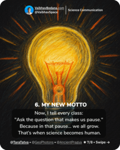 This moment wasn’t rare. Every teacher has a story like this. But what we do with it—that’s where transformation begins. Since that day, I’ve collected over 200 “pause questions” from students. And almost every one of them became the start of a deeper conversation. Some were silly. Some were profound. But all were real. Teaching that centers curiosity isn’t just better—it’s necessary. India has 260 million students, and 58% of them say they don’t feel emotionally connected to school. What if we flipped that stat by making classrooms feel like discovery zones? What if teachers were trained to embrace not-knowing, instead of fearing it? If that happened, we wouldn’t just teach science—we’d teach wonder. And that might just change the world.
