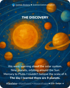 The day we learned the solar system, everything felt big. Like really big. I learned Earth isn’t the center—it’s just one of nine siblings. NASA’s planetary science guide says the average distance from Earth to the Sun is 149.6 million km. That’s like traveling from Delhi to Kanyakumari over 185,000 times. That day, I felt small—but not insignificant. I was part of something massive and spinning. According to a 2021 NCERT survey, 72% of school kids say learning space facts makes them feel more connected to nature. In that Ahmedabad classroom, Pluto was still a planet. And it made me believe I belonged in a story bigger than myself. It wasn’t just a chart. It was a map of possibilities. Science didn’t just give me facts. It gave me a place. Even now, I tell my students: when you know where you are in the solar system, you begin to ask who you are on Earth.