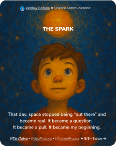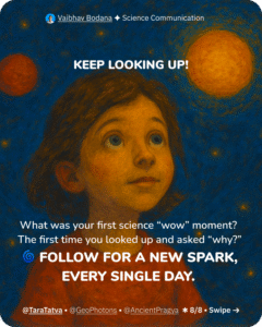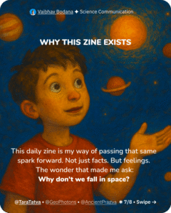 You never know which moment will shape your life. Mine was a sentence in Class 4 that flipped gravity on its head. Yours might still be waiting. Maybe it’s hidden in a sky full of stars, a silly science meme, or your kid’s bedtime question. Keep your mind open. And when in doubt, follow the question—not just the answer. As Carl Sagan said, “Somewhere, something incredible is waiting to be known.” So ask “why” like a child. Wonder like a scientist. And if this zine sparked something in you—follow along. Let’s share one new spark a day. Maybe your story starts here too.