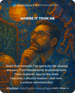 That one classroom question led me to blackboards, planetariums, and beyond. I became a physics teacher. But more than that, I became a science storyteller. According to data from Vigyan Prasar, India has over 5,000 trained science communicators today—but less than 15% come from teaching backgrounds. I wanted to be both. I saw how students’ eyes light up when science feels real. From gravity to galaxies, I wanted kids to know: it’s okay to be confused, to ask “why,” to never stop wondering. One of my students once asked if a star could love its planet. Beautiful, right? That’s what I live for. Science isn’t just facts. It’s feelings wrapped in facts. I didn’t chase space just for answers. I chased it for the joy of chasing. And now, I pass that spark on—one question at a time.