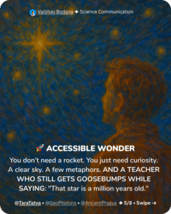 A common myth is that you need a telescope or expensive equipment to love astronomy. Not true. All you really need is a clear sky, some curiosity, and a little storytelling. I’ve done sessions in school courtyards, village rooftops, even roadside gatherings. According to Vigyan Prasar, outreach astronomy programs in rural India boost science interest by 41% without needing high-end gear. Once, during a power cut in Rajkot, I pointed out Venus with just my hand. A 10-year-old said, “Is that a diamond?” That’s the moment. That’s the magic. And when I explain light-years with a simple “if a bike traveled at light speed…” analogy, the gasps say it all. You don’t need to build a rocket to reach the stars. You just need to carry the spark—and pass it on.