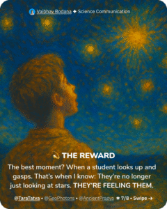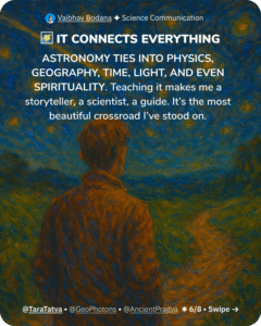 If you’ve ever looked up and felt something stir—that’s your sign. Maybe it’s time to bring that feeling into your classroom, your home, your heart. Astronomy isn’t about getting all the answers. It’s about falling in love with the questions. As National Geographic once wrote, “Astronomy is a gateway drug to science.” I believe that. And I live it. Every time a child says, “That star is a million years old?” and gasps—I remember why I started. You don’t have to be an expert. You just need wonder. So look up tonight. Pick a star. And remember: your next story might be hiding in that tiny dot of light. “Every time I teach astronomy, I feel like I’m holding a piece of the universe in my hands.”